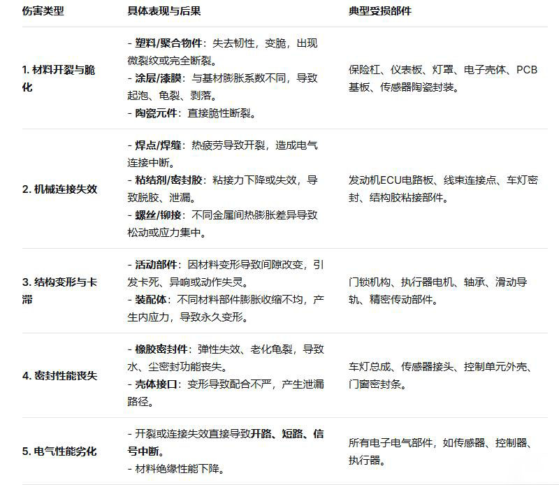 核心目的:模擬汽車配件在真實使用環(huán)境中遭遇的極端溫度驟變情況,檢驗其因材料熱脹冷縮不匹配、結(jié)構(gòu)設(shè)計缺陷等導(dǎo)致的物理失效。