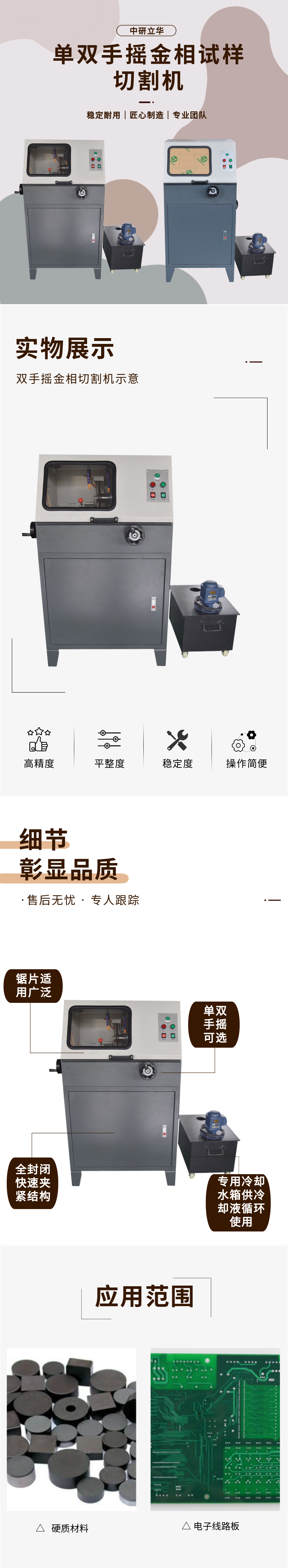 用途:單(雙)手搖金相切割機可適用于切割一般金相、巖相材料,為保證能在安全狀態(tài)下切割取樣,本機采用全封閉雙罩殼結(jié)構和快速夾緊裝置,并附有冷卻水箱。
