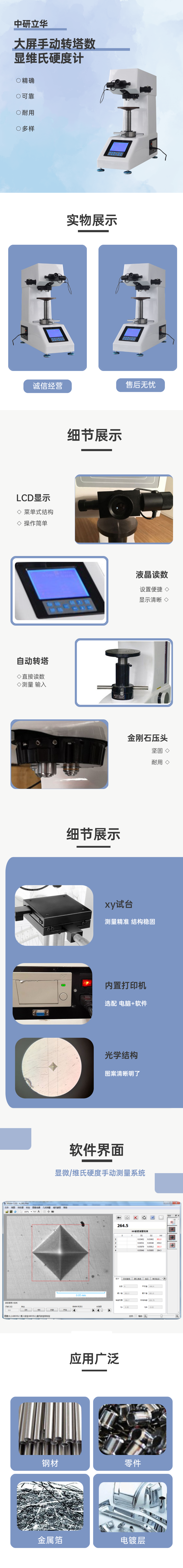 用途:主要用于各種金屬及部分非金屬材料的顯微維氏硬度測(cè)定,能夠?qū)Ω鞣N零件(機(jī)加工件、鍛件、鑄鐵、鑄鋼件等)、有色金屬、熱后處理零件等進(jìn)行硬度的測(cè)定。
