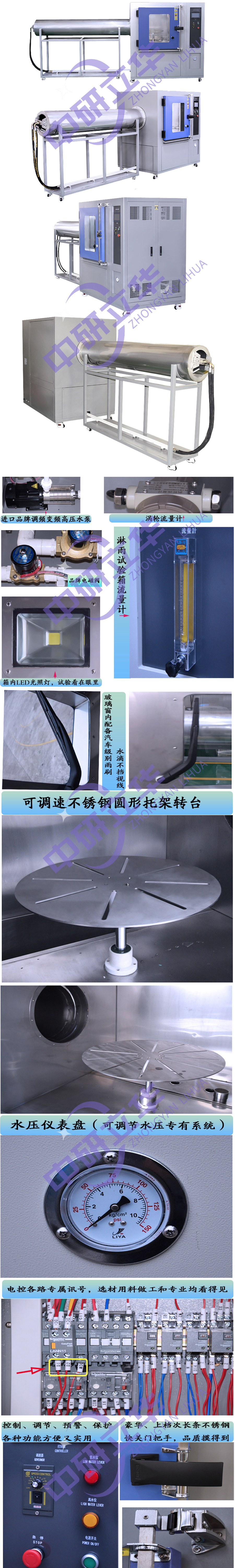 介紹:IP56淋雨測試箱模擬滴水,淋水,濺水,噴水等各種環境,主要適用于通訊產品、汽車零部件戶外照明及信號裝置等產品做防水性能測試及IP防水等級測試。