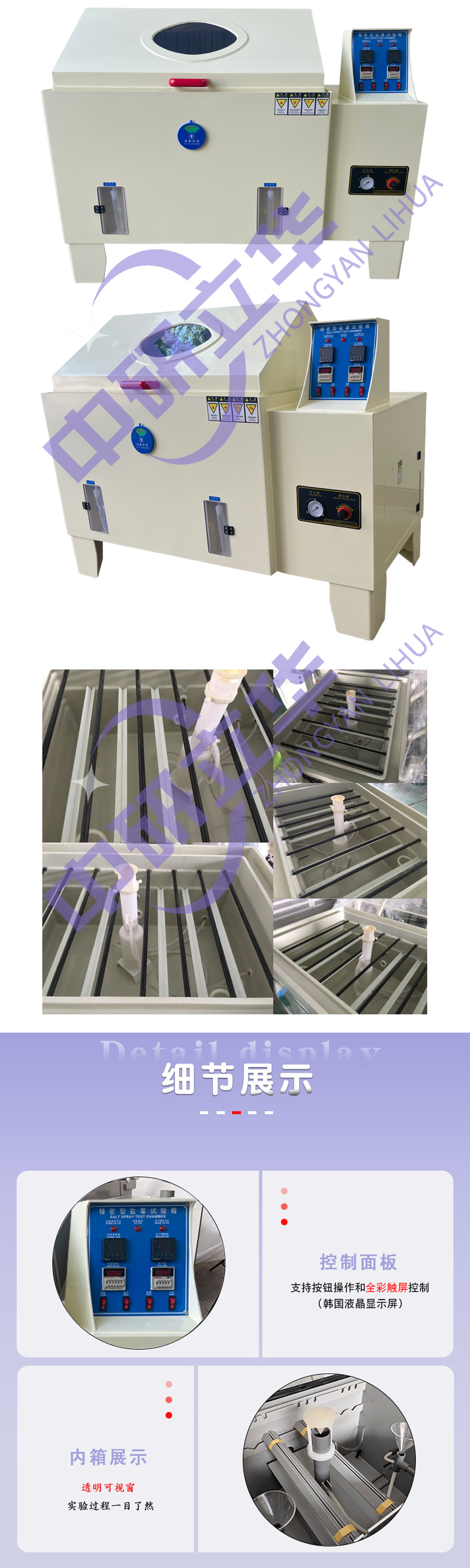 | 除霧方式 | 借空氣擠壓將霧氣排出,箱蓋為錐形設(shè)計(jì),成120℃頂角,有利于鹽霧產(chǎn)生的液滴不直接滴落咋在試樣上,保證了試樣的準(zhǔn)備度。 | |||||